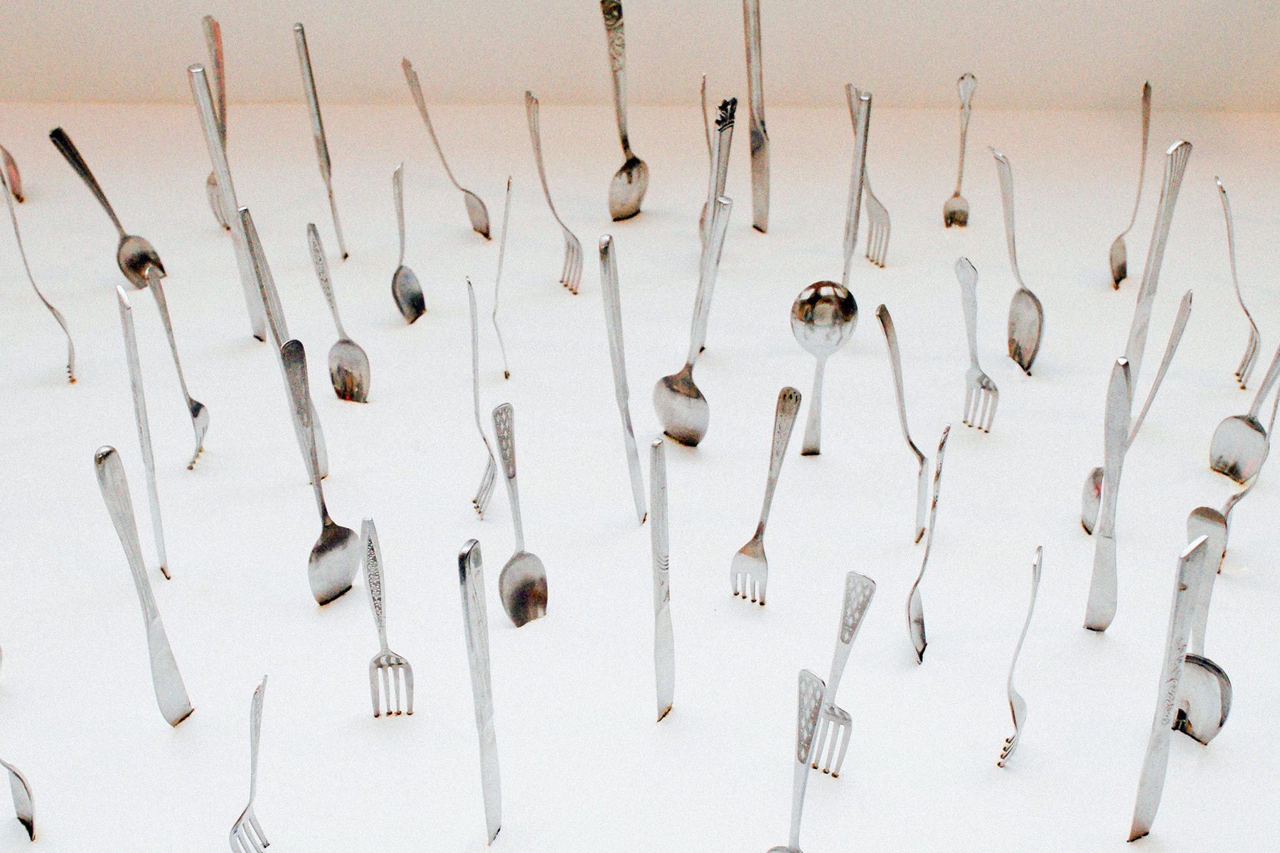 Light grey walls combine with a range of wood in various textures and stains. Modern dining seats are combined with custom plywood abstract bar stools in spaces divided by a vertical display shelf wall. Custom black steel pipe and elbow fixtures extrude from the ceiling, terminating with a simple round bulb for the space’s general lighting. Woven basket bar pendants with anchor shaped purse hooks below mix with an abstract silverware puncture art wall for a grounded, natural concept for a feel-good, casual vibe.
